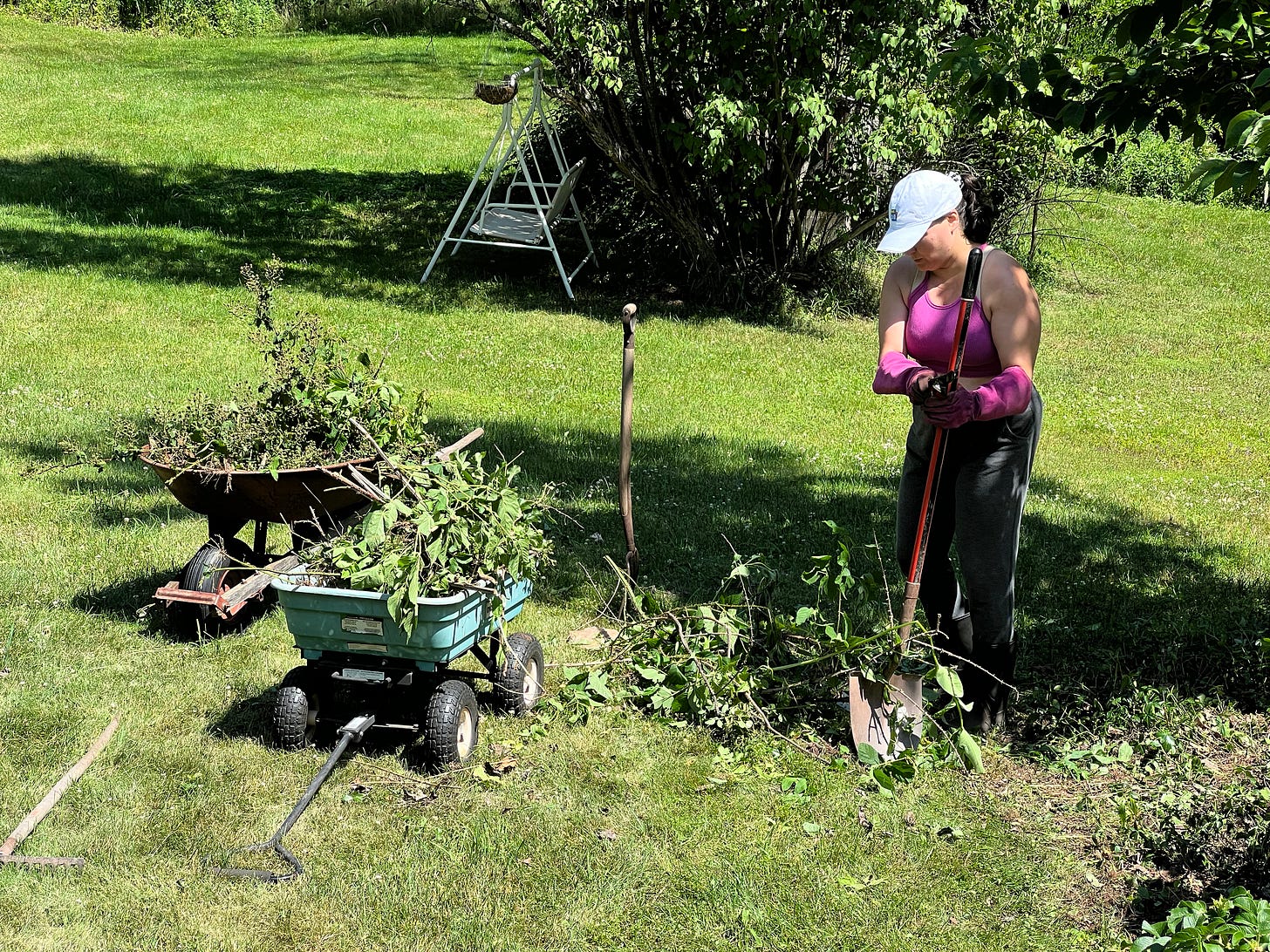 Tearing out a dozen or more wheelbarrow’s worth of this thorny and massive foliage took me hours and left me with scratches and punctures all over my arms and legs. And you know what? It felt good. I felt strong. I slept well each night, after a stressful week of work, because I worked my body and the land. Yes, the land. It felt that olde timey.