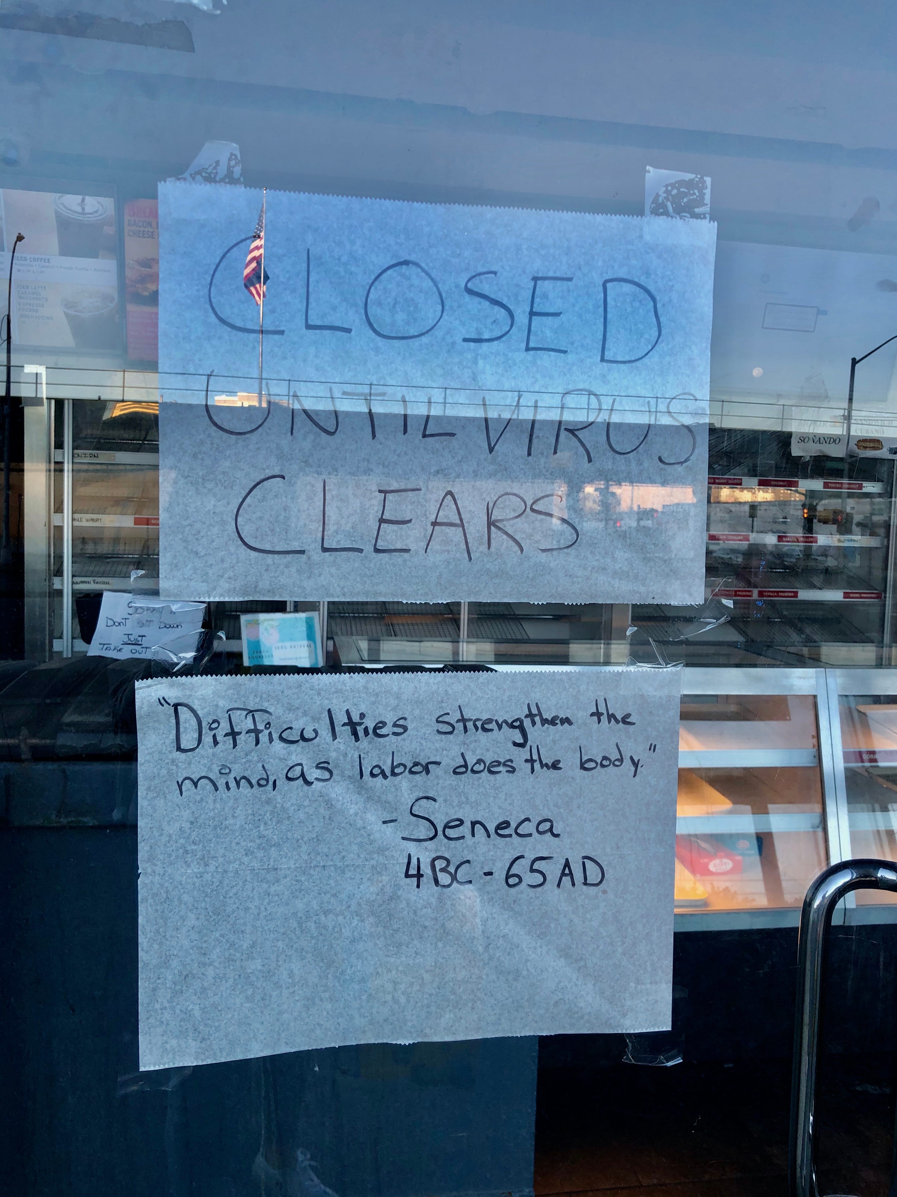 I know I am not alone in reaching for poetry to make sense of this moment. My Instagram feed is filled with poetry. The words often come from unexpected sources: the design blogger, the artisanal soap maker upstate, the humorless journalist I follow because I always thought there was something deeper in her that just needed to be unleashed. Even the doughnut shop around my corner posted a poetic sign announcing its closing for the Great Pause, aka the “stay at home order.” Many of these signs are found poetry. We are all longing for connection and it’s as if we can only say this in snippets, metaphor, quotes and hints of ideas, perhaps because we fear saying it outright: